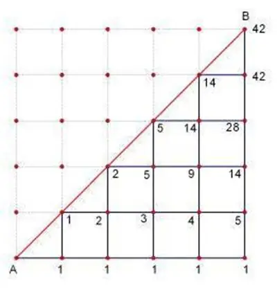 有一个大小为 方格图,左下角为 (0,0) 右上角为 (n,n),从左下角开始每次都只能向右或者向上走一单位,不走到对角线 上方(但可以触碰)的情况下到达右上角有多少可能的路径?
