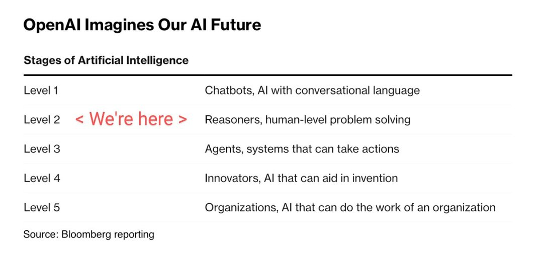 2022 年的 ChatGPT 处于 Level 1 的水平,而我们当前(2024)正处在 Level 2 水平,这是一个 AI 可以协助推理,处理人类问题的水平。