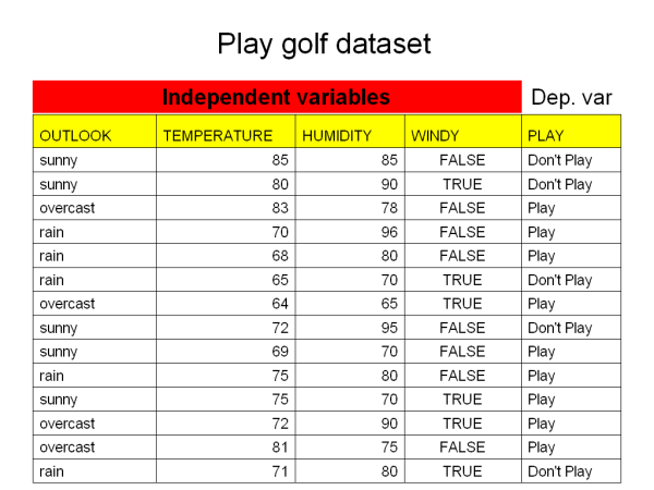 上表中有天气、温度、湿度、起风四个条件,PLAY 室外活动为结果。