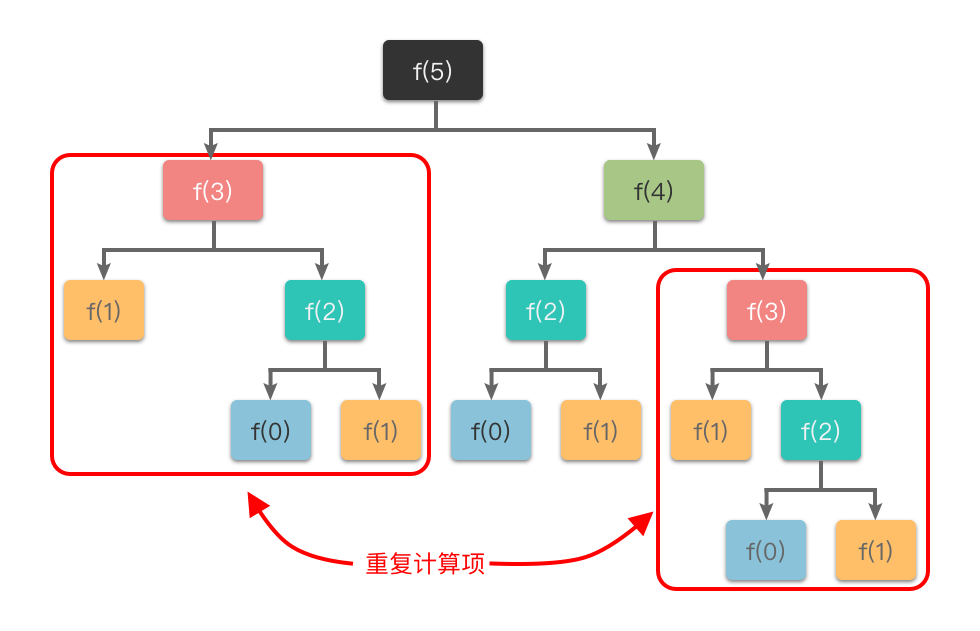 - 以上的“重复计算项”即为一个重叠子问题,在计算完成之后即可获得最优子结构。